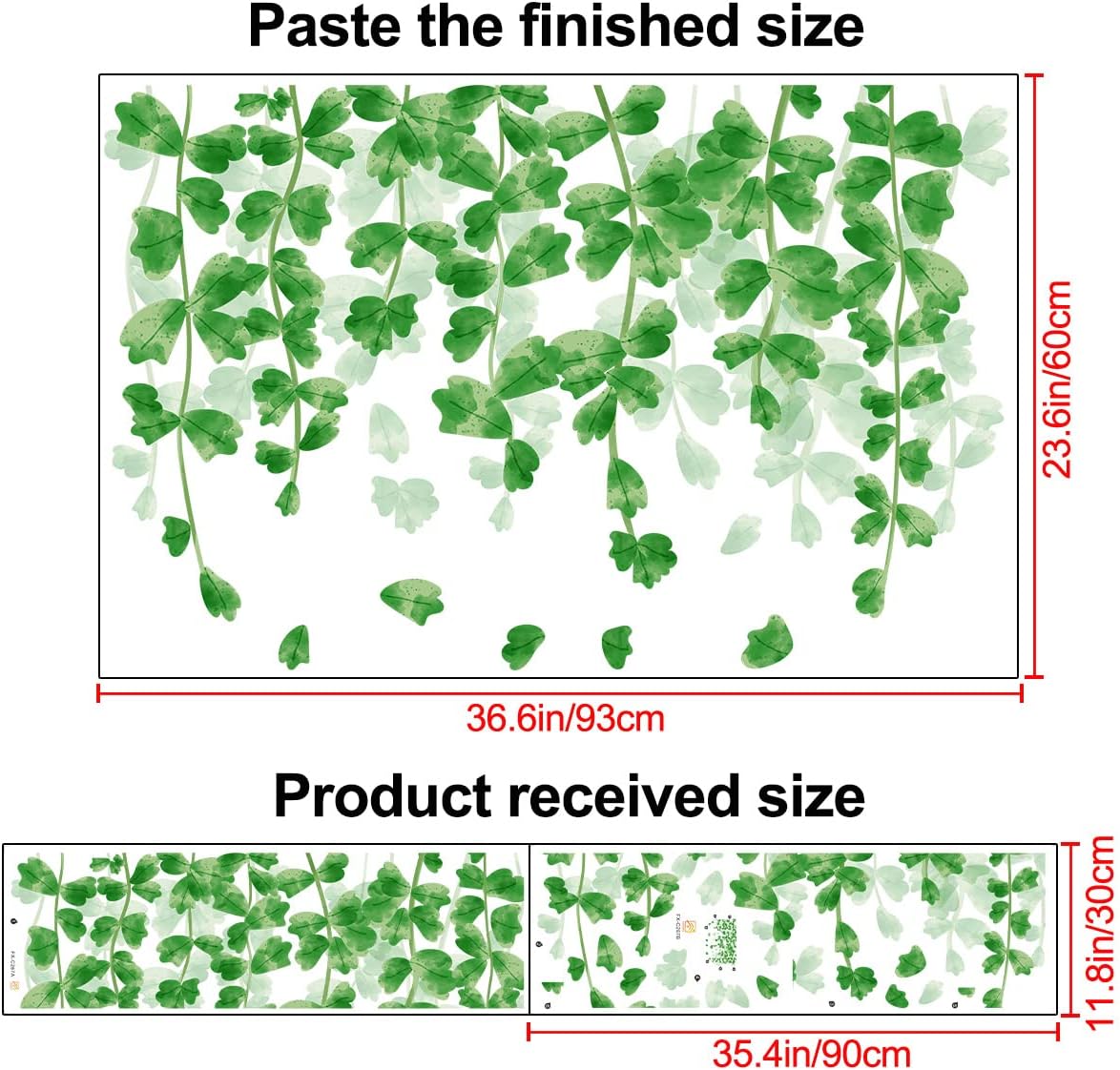 - The green vine decals on the wall is really great decorations for any smooth wall or window decorations, holiday party supplies. Add some color to your room, create a cute and lively atmosphere. Finished Size: 36.6β x 23.6β / 93cm x 60cm. This green vine leaf wall decals include 2 sheets. Each size: 12β x 36β / 30cm x 90cm.