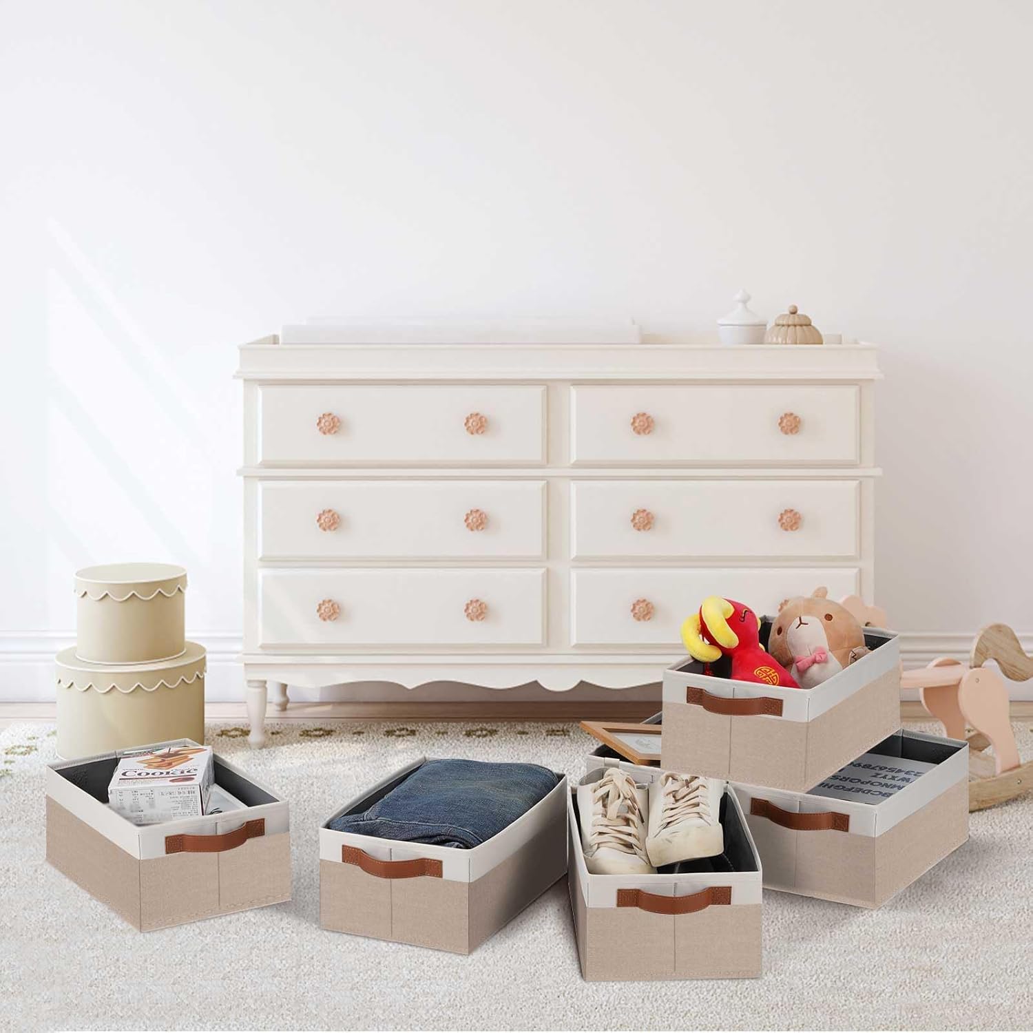 - 👍【QUALITY MATERIAL】Storage baskets for shelves are made of high-quality cationic fabric and polyester cotton fabric, and the inner layer is made of non-woven fabric, which is odorless, long-lasting and strong. Classic faux leather handles that adds a comfortable touch and provides a strong and comfort grip to pull and move. Fabric storage bin is easy to clean, just wipe with a damp sponge or cloth