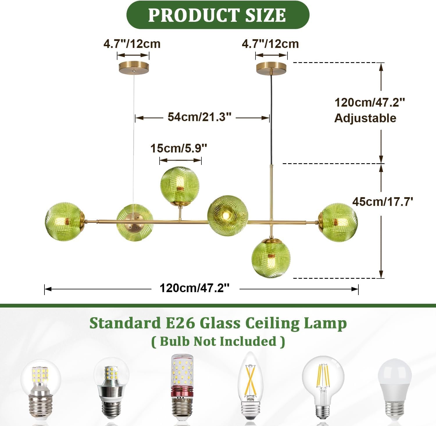 - Linear Chandelier Size: The modern dining room light fixtures over table length: 47.2" (120cm), height: 17.7"(45cm), glass shade: 5.9"(15cm), canopy: 4.7"(12cm). Light source: E26 (bulb not included), voltage: 110-220V for worldwide. Can be dimmable when used dimmable bulb and switch