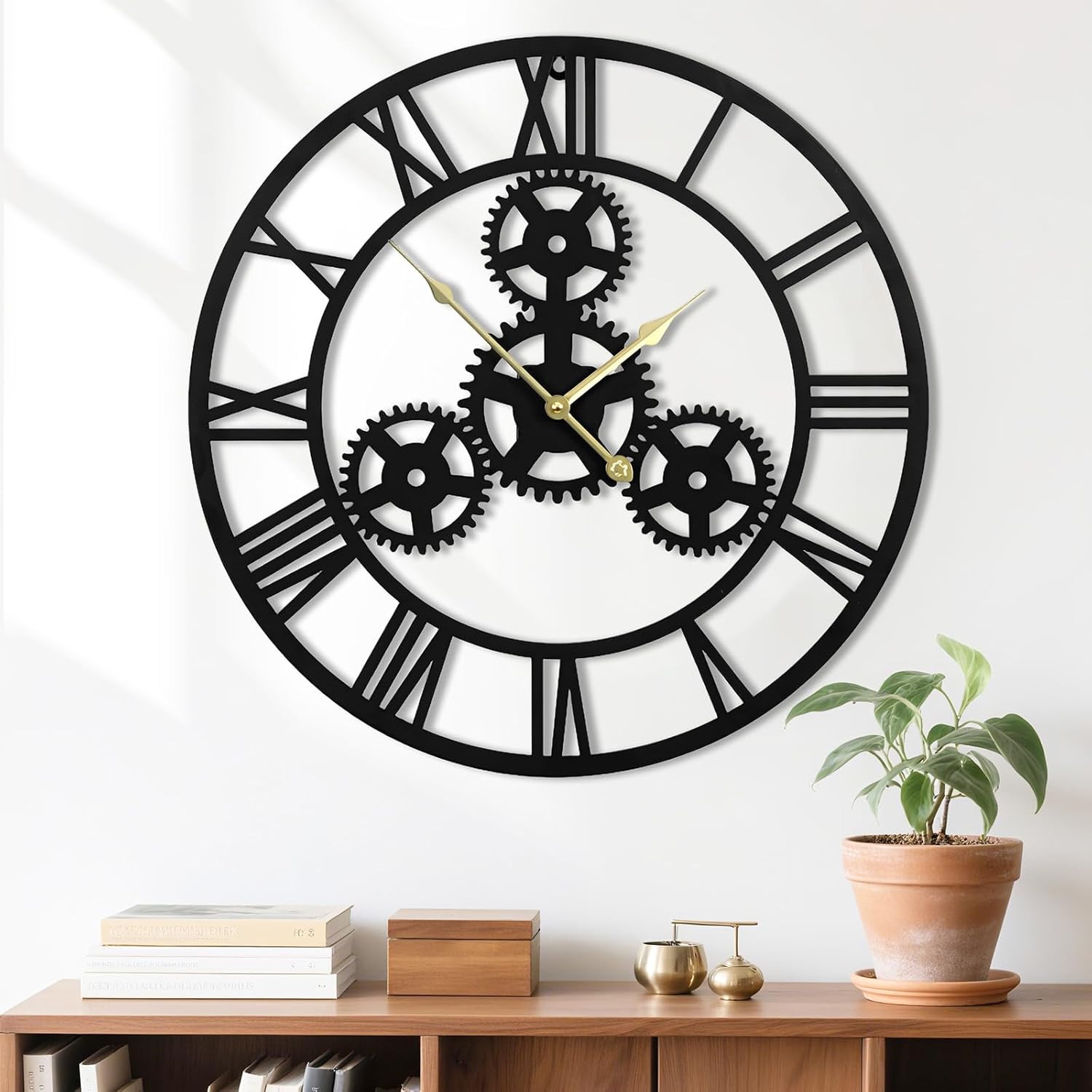 - Black Metal Wall Clock: 24-inch diameter wall clock for living room is made of Metal, industrial-style gear mechanisms and Roman numerals and the thicken frame is very strong and sturdy.It's not only a large clock ,but also a great iron art work.High quality wall clock movement offers you more peaceful moments!The rear slot design is easy to hang as well,
